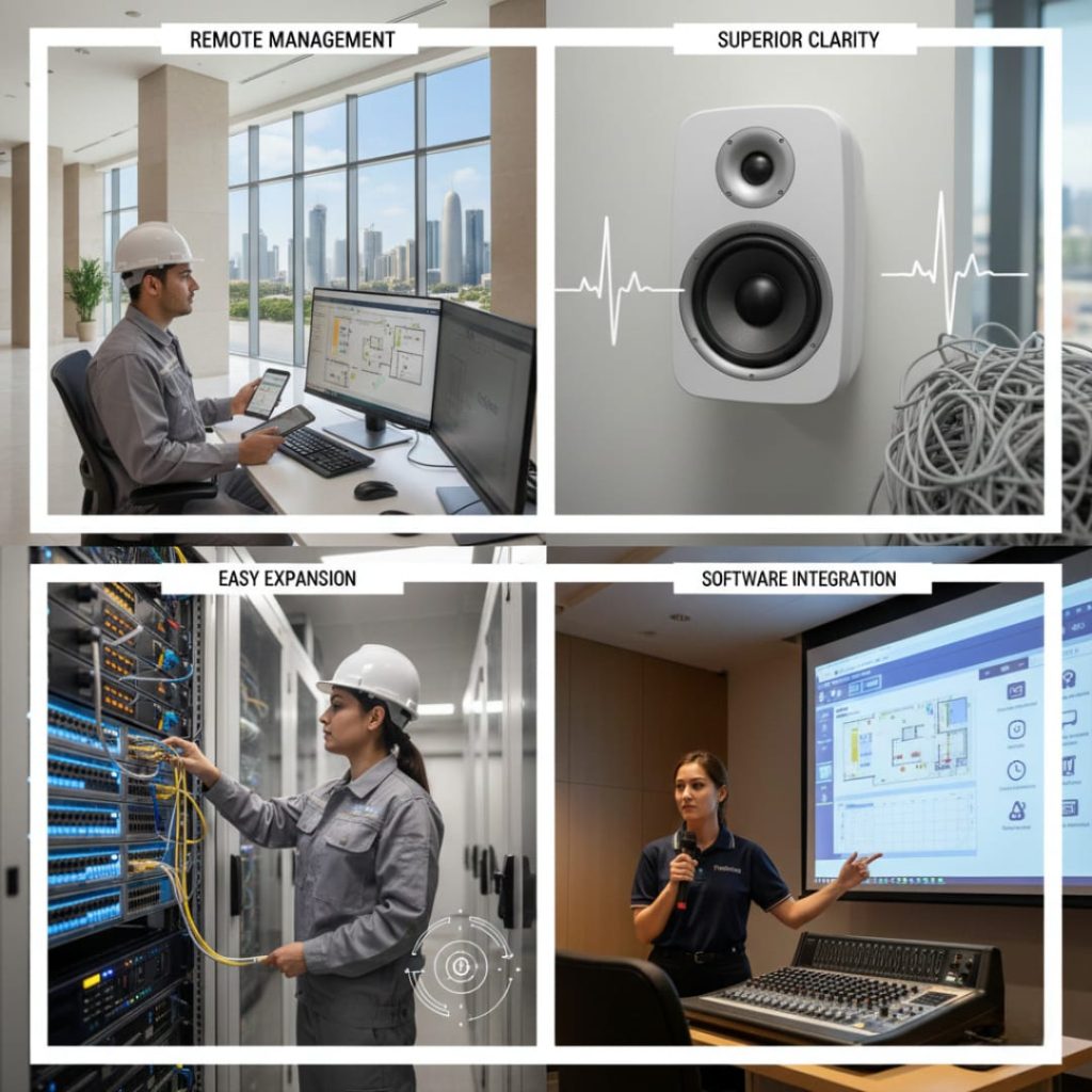 The transition from analog to digital has revolutionized how we manage audio. Techspine is at the forefront of deploying IP-based public address systems that offer unlimited scalability. Traditional systems are limited by cable distance and hardware ports, but IP solutions utilize your existing IT network infrastructure.